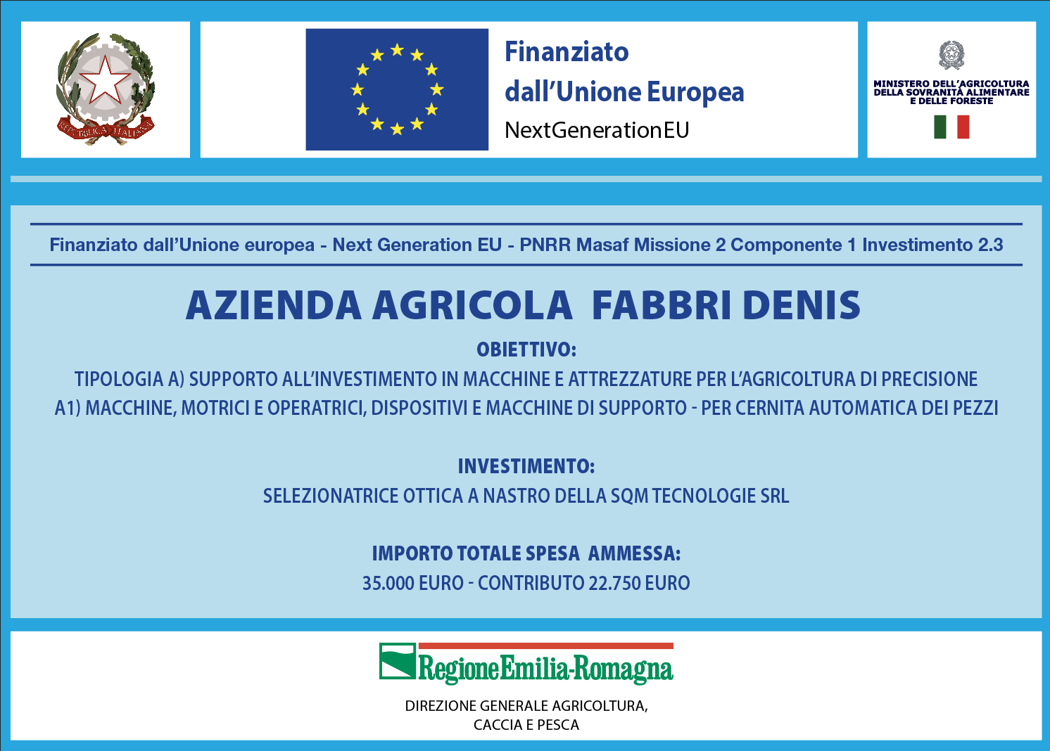 L’Azienda Beneficiaria, Agricola Fabbri Denis, ha recentemente acquisito una selezionatrice ottica a nastro della SQM Tecnologie S.r.l., nell’ambito del bando per l’ammodernamento delle macchine agricole promosso dalla Regione Emilia-Romagna con fondi PNRR.
